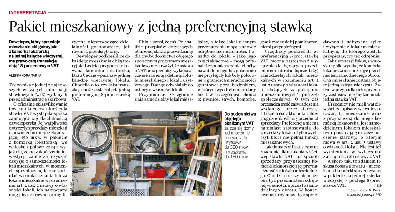 Nadchodzi zmiana interpretacji przepisów dotyczących sprzedaży mieszkań wraz z komórkami lokatorskimi. Zgodnie z najnowszymi wyjaśnieniami administracji skarbowej, deweloper, który sprzedaje mieszkanie z przypisaną do niego komórką lokatorską, ma prawo zastosować obniżoną stawkę VAT w wysokości 8% na całą transakcję, o ile komórka jest wpisana do tej samej księgi wieczystej co mieszkanie. Jest to korzystne dla deweloperów, którzy dzięki temu mogą oferować niższe ceny za mieszkania z komórkami lokatorskimi. Przepisy VAT, choć nie definiują dokładnie pojęcia lokalu mieszkalnego i użytkowego, pozwalają na preferencyjne opodatkowanie całości transakcji w takich przypadkach. Więcej informacji: tutaj